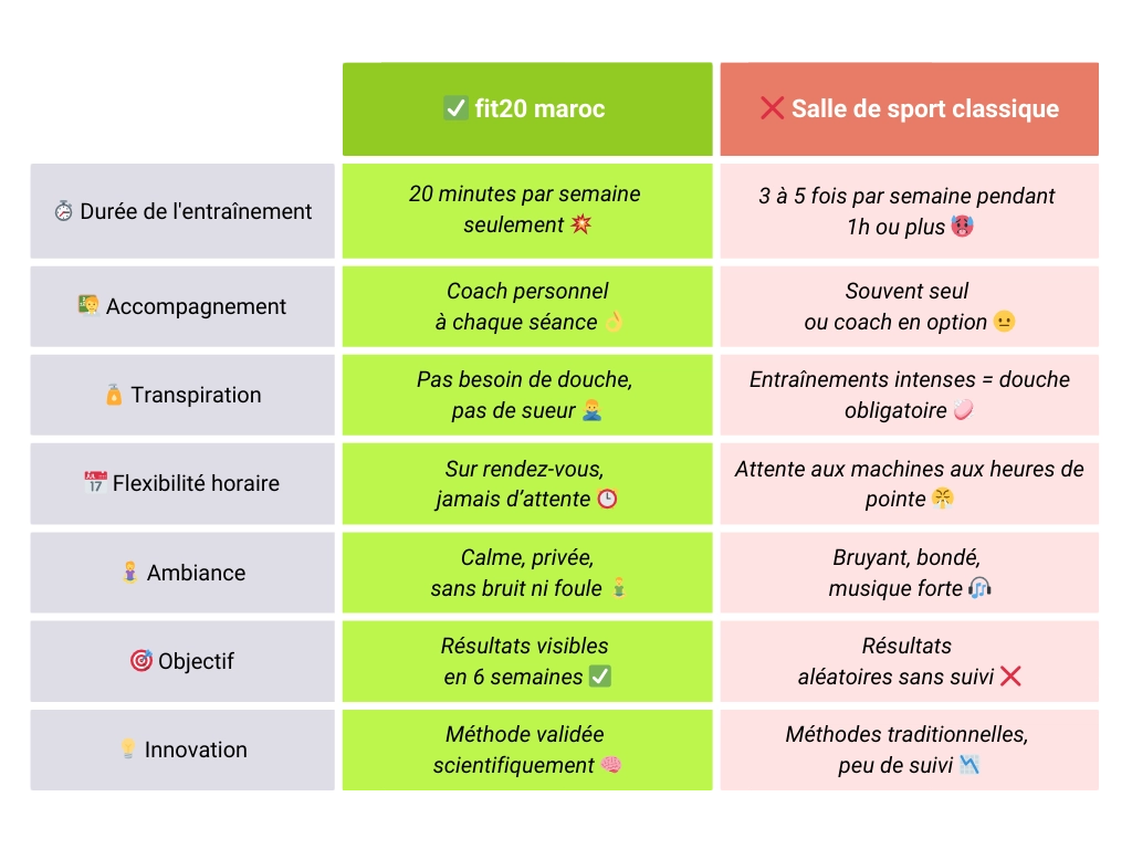 Comparatif : fit20 Maroc vs Salle de sport classique.